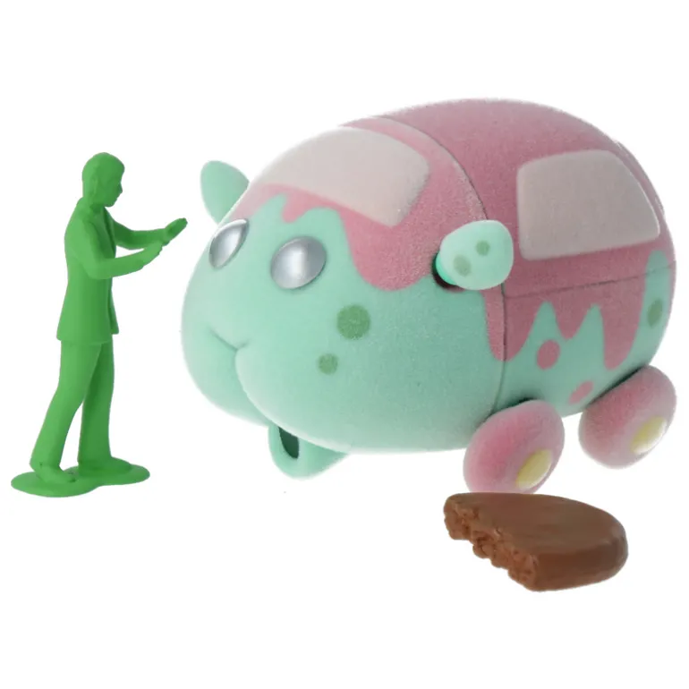 Esta figura se entrega con dos expresiones intercambiables, la mitad de los pasteles y una mini figurina verde.